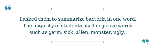 When developing Bacteria Combat, I carried out research with over 300 students in Scotland and England. I asked them to summarize bacteria in one word. The majority of students used negative words such as germ, sick, alien, monster, ugly. Further reading around this, and discussions with microbiology outreach experts Professor Mark Martin, Uni of Puget Sound and Dr. Anne Estes Hearn, University of Maryland, made me realise how widespread this attitude was. It was therefore unsurprising that as a society we overuse antibiotics so frequently. There is a lack of respect for our resident microbiota.