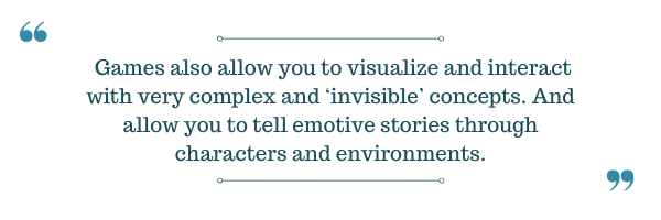 Personal to me, I believe games are highly accessible and allow us to work with lots of different types of people. Games also allow you to visualize and interact with very complex and ‘invisible’ concepts, and allow you to tell emotive stories through characters and environments.