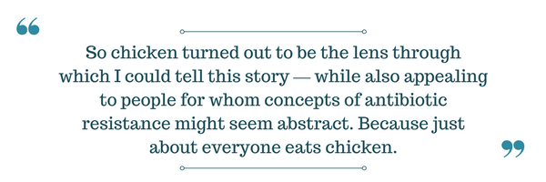 A few years ago — while researching my last book, SUPERBUG, which is a sort of biography of MRSA — I ran across the statistic that four times as many antibiotics are sold for animal use in the United States as for human use. This astounded me, mostly because it made no sense. Medicine is always telling physicians and the public to use antibiotics conservatively; how could those cautions exist in the same time and space as an industry that gave antibiotics without prescription to animals that were not sick? So I decided to find out. It didn’t take long to discover that chickens were the first animals to receive “growth promoter” antibiotics experimentally, and also that the intensive poultry production those drugs created became a model for the rest of the industry — the basis of everything we think of as factory farming. To close the loop, it also turns out that, at least in the United States, chicken may be the first sector of the protein economy to relinquish routine antibiotic use. So chicken turned out to be the lens through which I could tell this story — while also appealing to people for whom concepts of antibiotic resistance might seem abstract. Because just about everyone eats chicken.