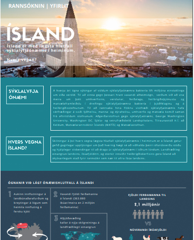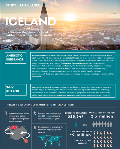 ARAC, Landspitali, the National University Hospital of Iceland, the Experimental Institute at Keldur, MATÍS, and the Icelandic Food and Veterinary Authority have formed an interdisciplinary, international consortium that will study antimicrobial resistance in Iceland, a unique and ideal location to study this growing public health threat. The consortium will undertake a national scale One Health study to advance our understanding of how antimicrobial-resistant bacteria from environmental sources, such as food and food animals, could impact human health. The project launched in November 2019. The infographics below tell you more about the project and answer the question of "Why Iceland'? Read the press release.