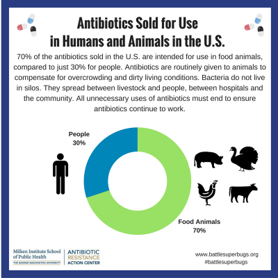 All uses of antibiotics contribute to the antibiotic resistance crisis we face. According to the most recent publicly available data, more than 35 million pounds of antibiotics are sold for use in food animal production every single year in the U.S. compared to 7 million pounds in human medicine.