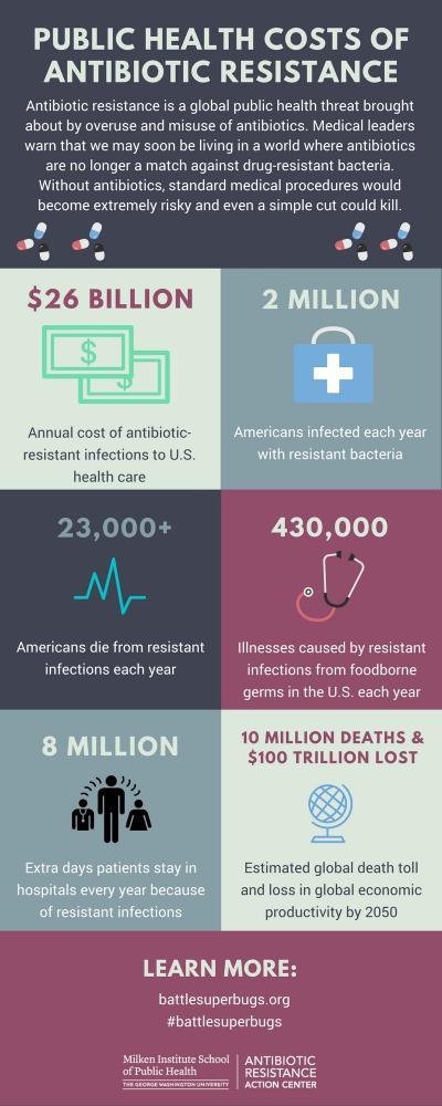 The annual costs of antibiotic-resistant infections in the U.S. range as high as $20 billion in direct healthcare costs, with additional costs to society for lost productivity as high as $35 billion a year.